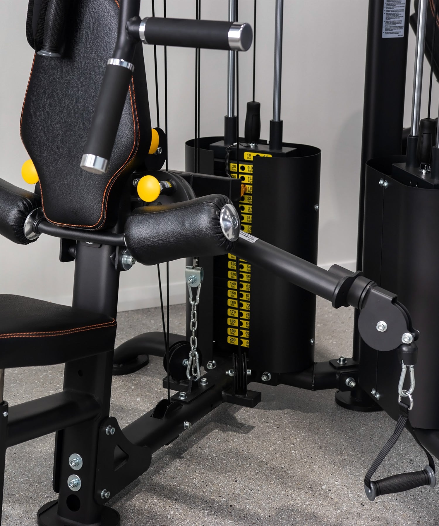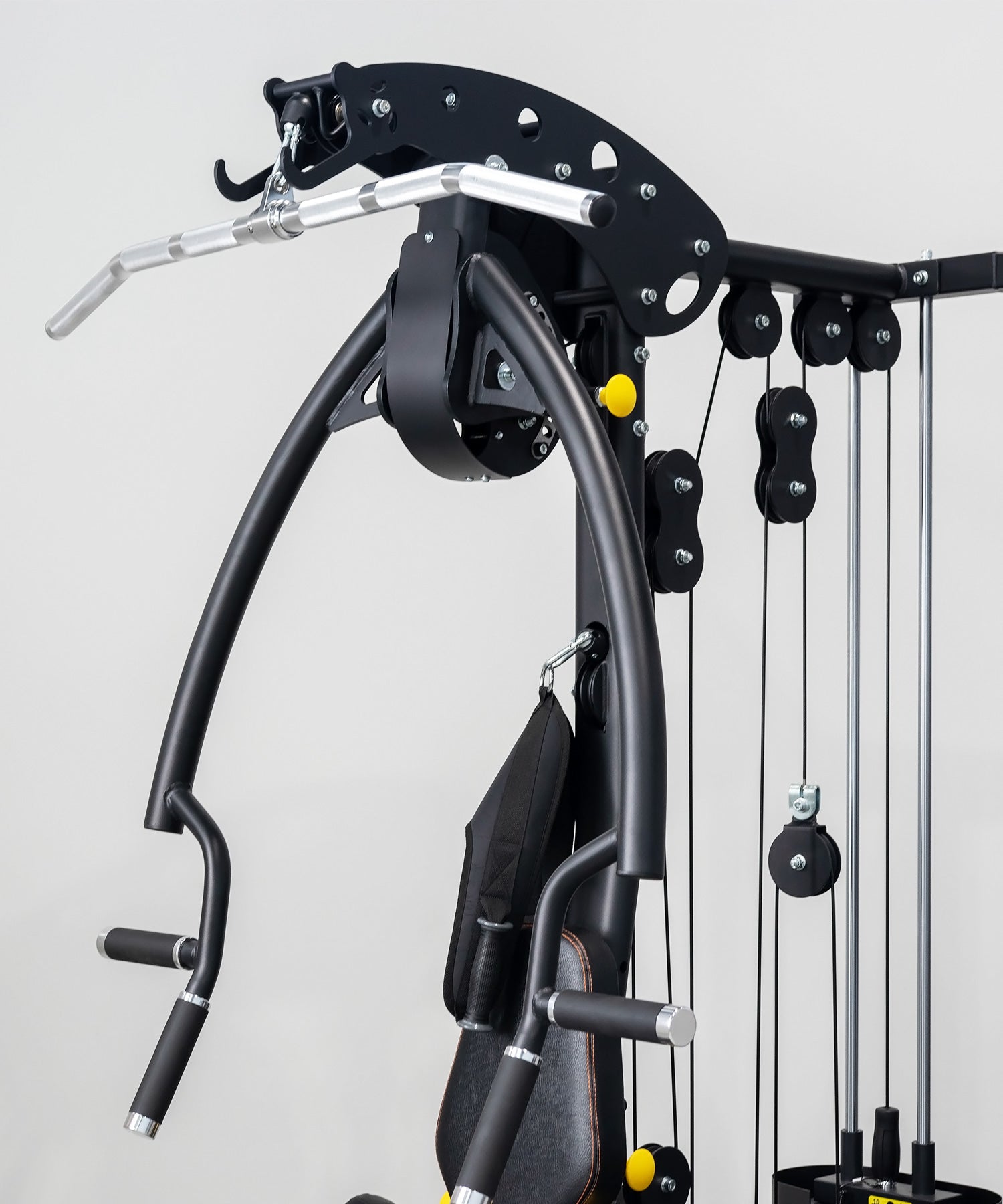 This Gym also includes a lat pulldown with 2 knee-locking pads. Face the gym and lock your legs in then reach for the high lat pulldown attachment and perform lat pulldown exercise using the heavy 90kg steel weight stack.